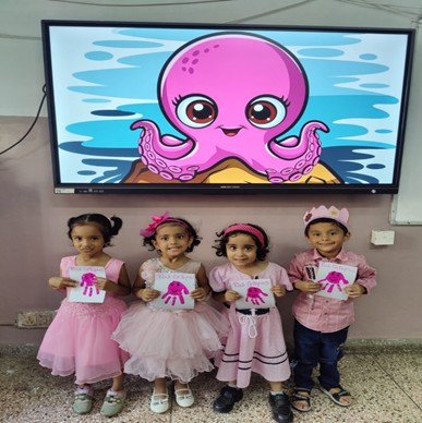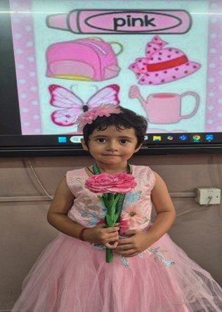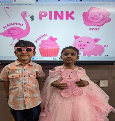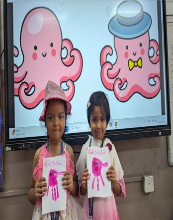 A vibrant Pink Colour Day Celebration was organized for Pre-School students. They came dressed in pink attire and spoke a few sentences about pink-coloured objects, exploring their creativity and language skills. They also created an octopus using their handprints, which they took home as a take away.